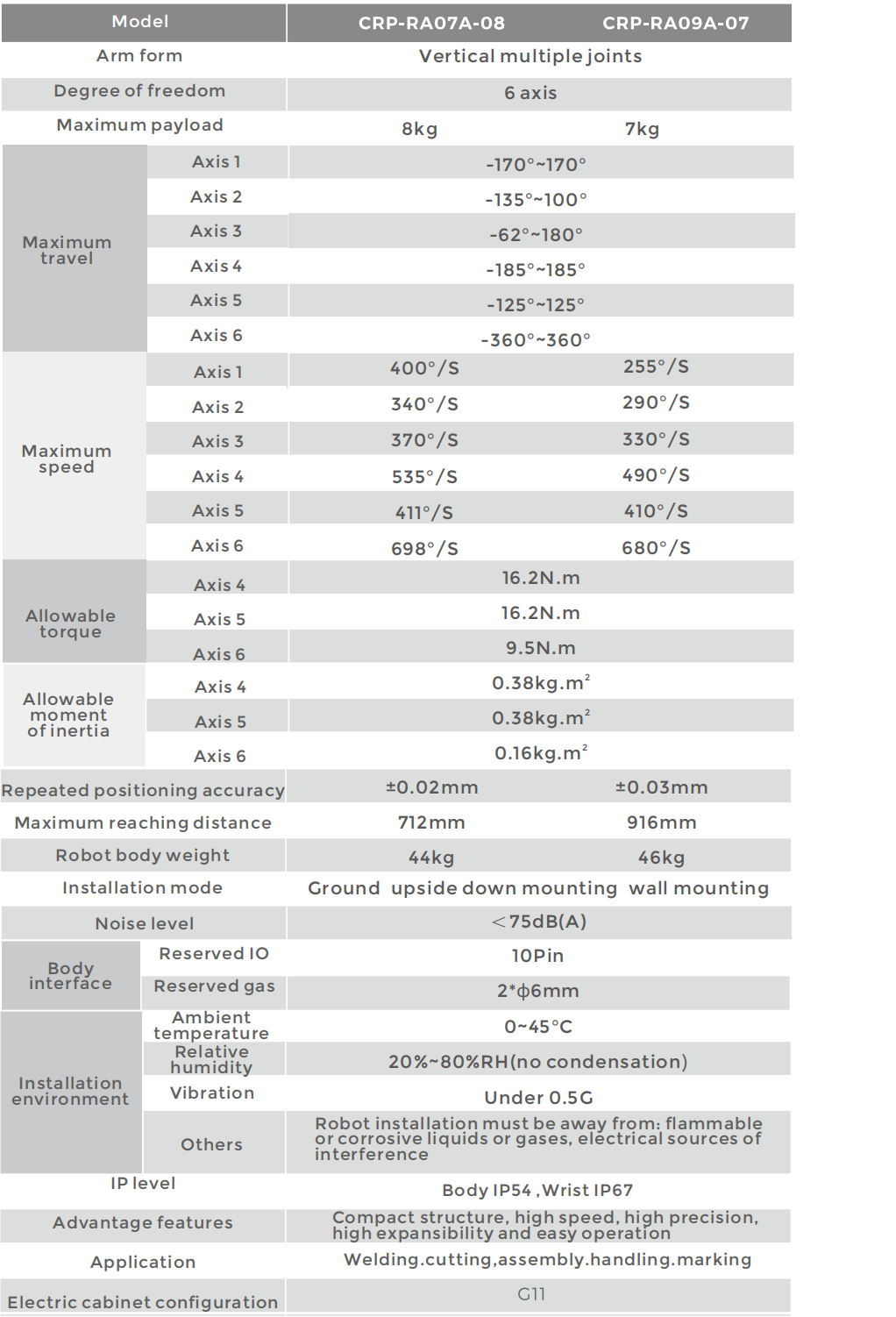 The arm span is 916mm. It has strong payload capacity, and rated payload 7kg. It is easily applied in multi application.