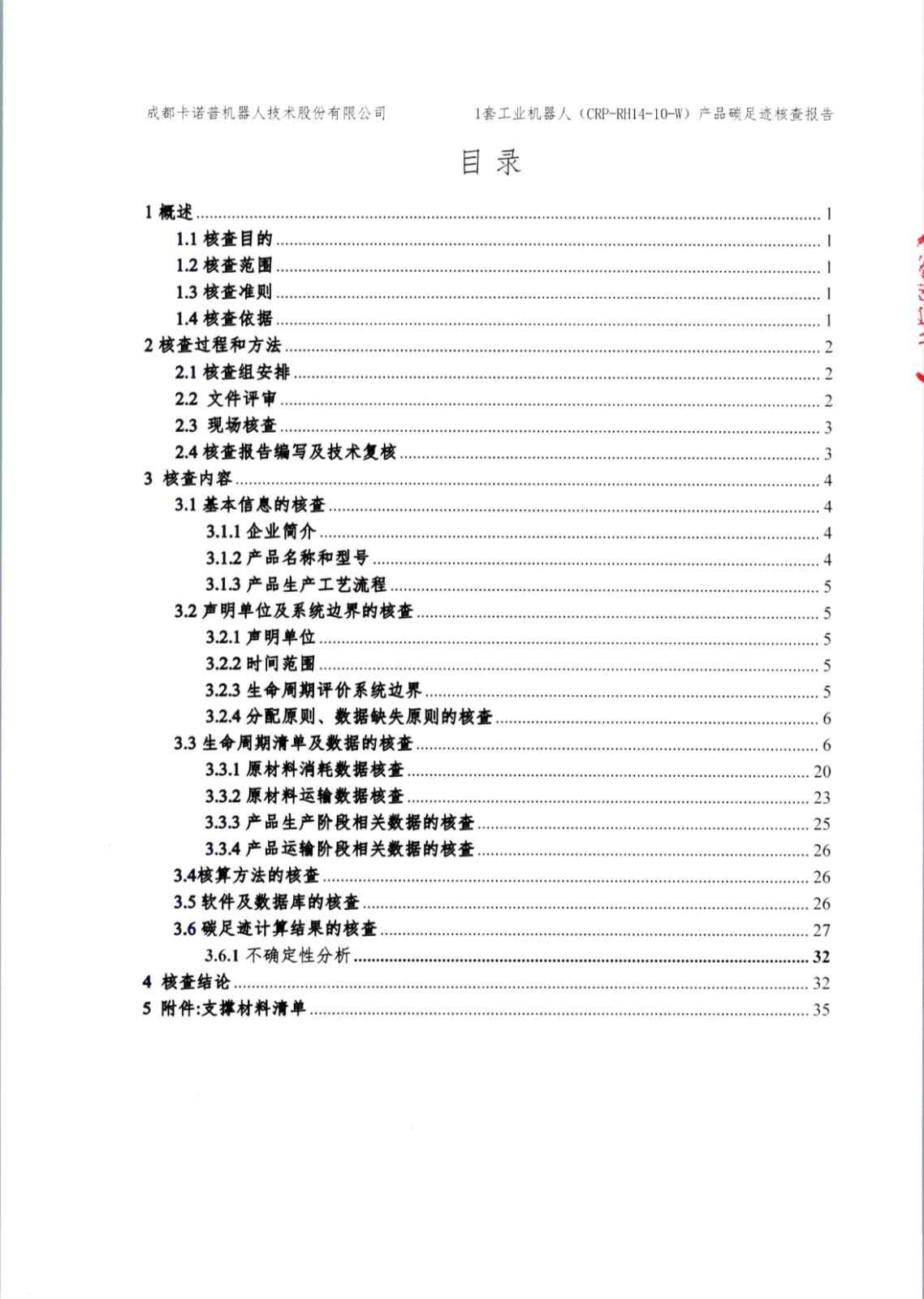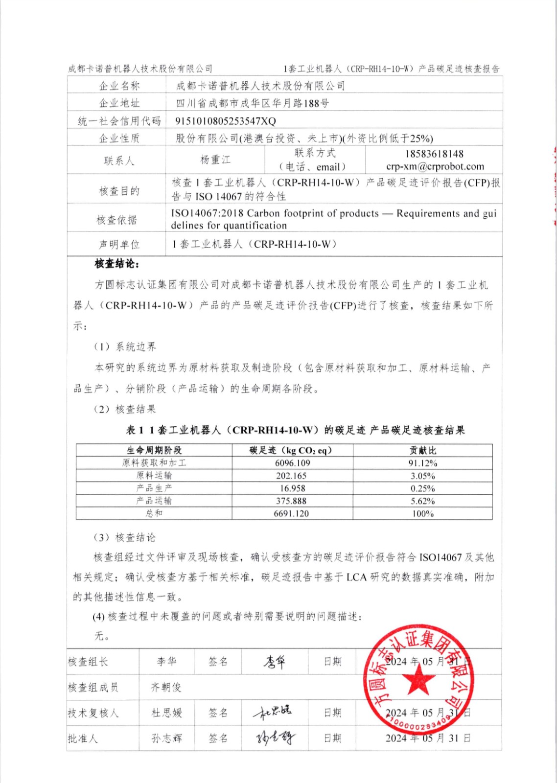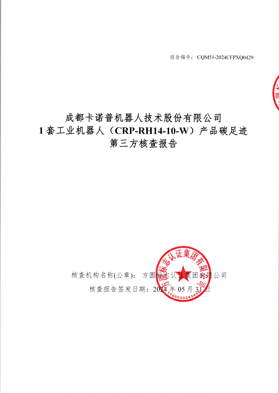 成都星空電競機(jī)器人技術(shù)股份有限公司1套工業(yè)機(jī)器人(CRP-RH14-10-W)產(chǎn)品碳足跡第三方核查報告