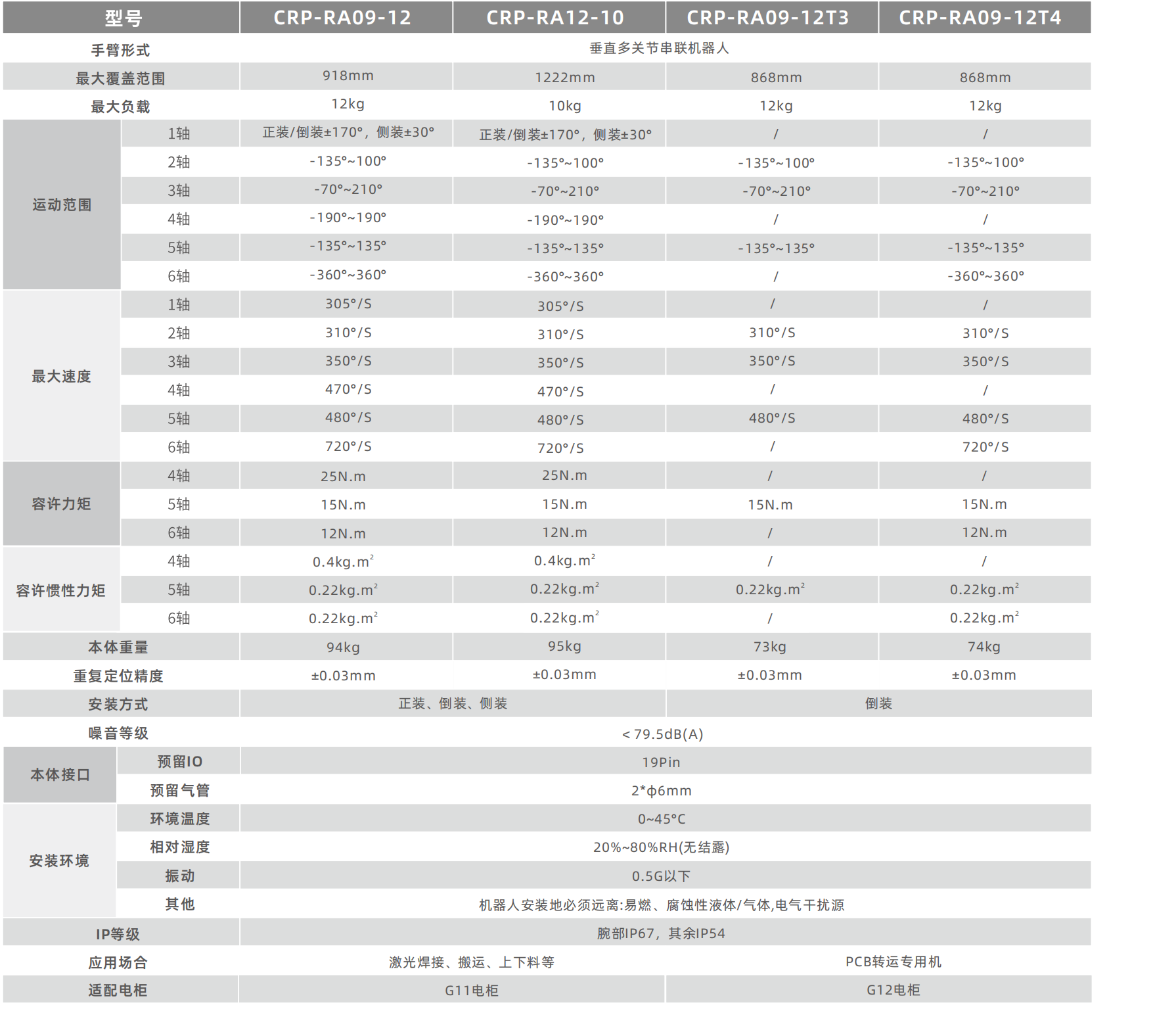 高速高精,效率更高。整機(jī)采用全鋁機(jī)身設(shè)計(jì),較同級(jí)別產(chǎn)品質(zhì)量更輕,RA09-12系列相比RA09A-07系列左右速度提高了30%,標(biāo)準(zhǔn)門型軌跡0.42S,重復(fù)定位精度士0.03mm,實(shí)現(xiàn)快速生效,提高生產(chǎn)產(chǎn)能。